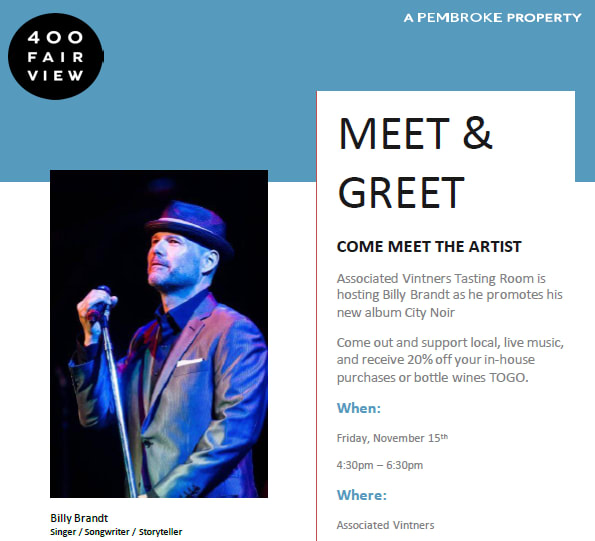 Associated Vintners Tasting Room is hosting Billy Brandt as he promotes hist new album City Noir. Come out and support local, live music, and receive 20% off your in-house purchases or bottle-wines TOGO.